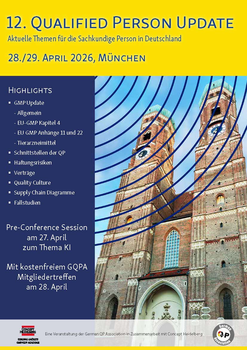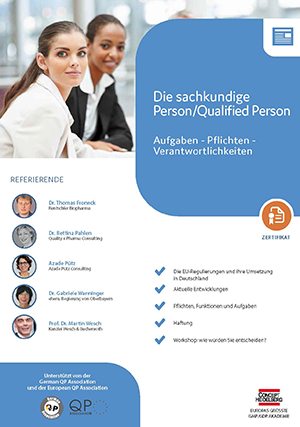 Lernen Sie in diesem Seminar das wichtigste über die Pflichten, Verantwortlichkeiten und Befugnisse der sachkundigen Person (Qualified Person). Profitieren Sie von der Erfahrung der Referentinnen und Referenten aus Behörde und Industrie und den in diesem Seminar angebotenen Lösungsansätzen.