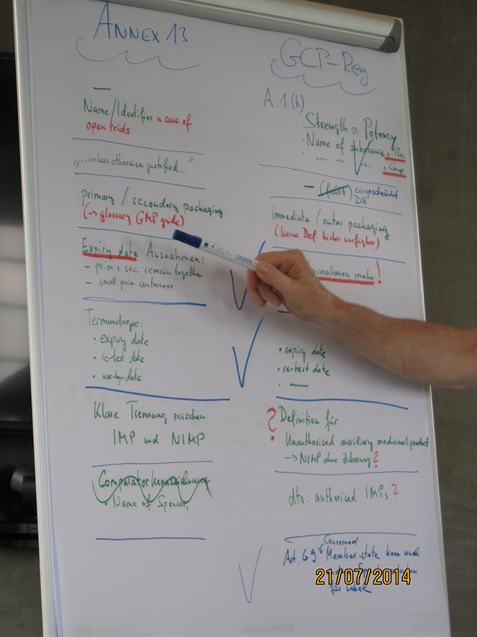 Am 21. Juli 2014 hat das erste Face-To-Face-Meeting der IMP-Expertengruppe der GQPA im „Wasserturm Stromeyersdorf“ in Konstanz stattgefunden. Die Teilnehmer konnten sich bereits am Vorabend bei einem gemeinsamen Abendessen in entspannter Atmosphäre direkt am Bodensee kennenlernen. Erfreulicherweise konnten alle 11 QPs der Expertengruppe an dem Ganztagestreffen und den konstruktiven Diskussionen teilnehmen. Hauptdiskussionspunkt am 21. Juli wurde die neu in Kraft getretene „GCP Regulation“ (EU Verordnung vom 16. April 2014 über klinische Prüfungen mit Humanarzneimitteln und zur Aufhebung der Richtlinie 2001/20/EG, gültig ab 2016). Die einzelnen daraus abgeleiteten Themen wurden in Arbeitsgruppen erarbeitet und anschließend gemeinsam ausdiskutiert. Dabei ging es u.a. um die Gegensätze innerhalb der Labelling-Anforderungen zwischen der neuen GCP Regulation und dem aktuellem Annex 13. Die neue GCP Regulation wird zahlreiche Auswirkungen auf die zukünftigen IMP-Aktivitäten innerhalb Deutschlands (EU) und die gültigen deutschen Gesetzestexte haben.